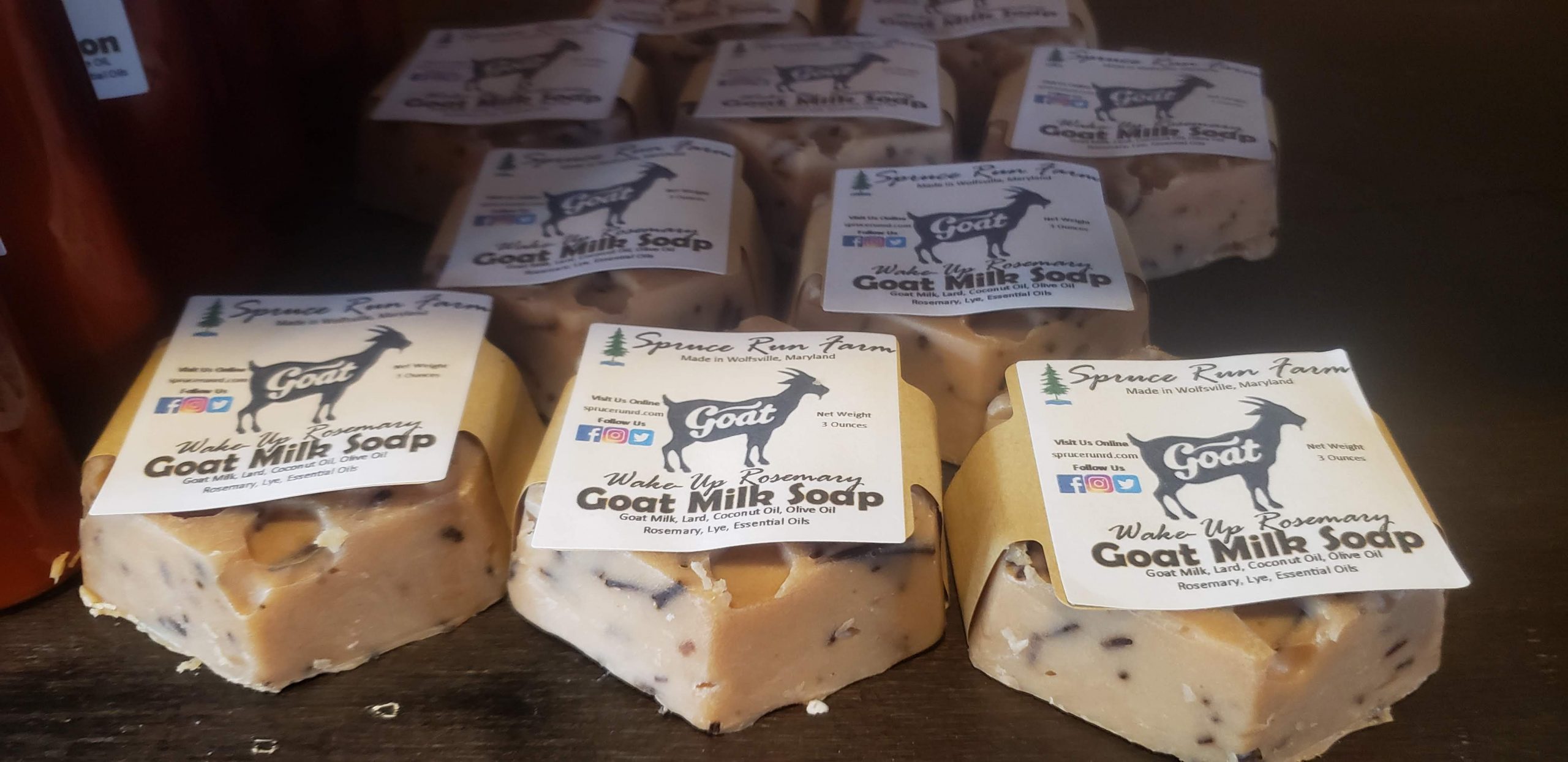 The goats of Spruce Run Farm earn their keep using their super-moisturizing milk to create our collection of all natural soaps. No artificial colors or fragrances, we use fresh herbs we have grown along with essential oils to make our soaps look attractive and smell wonderful.
